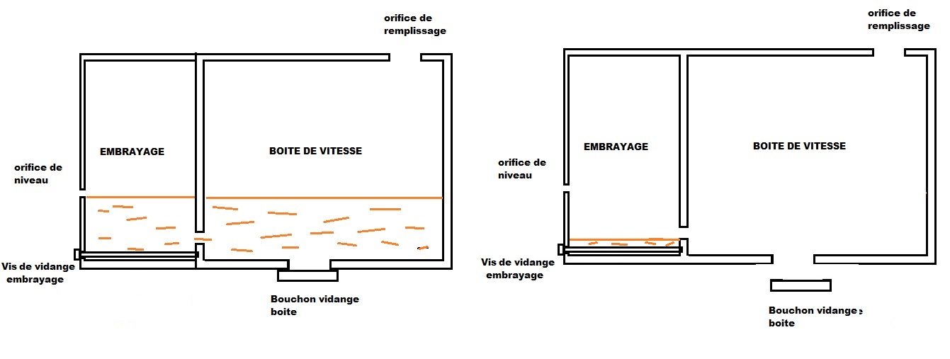 Il existe des conduits entre le carter de boite de vitesse et celui où se trouve l'embrayage et la transmission primaire de sorte que ces derniers sont également lubrifiés par la même huile.