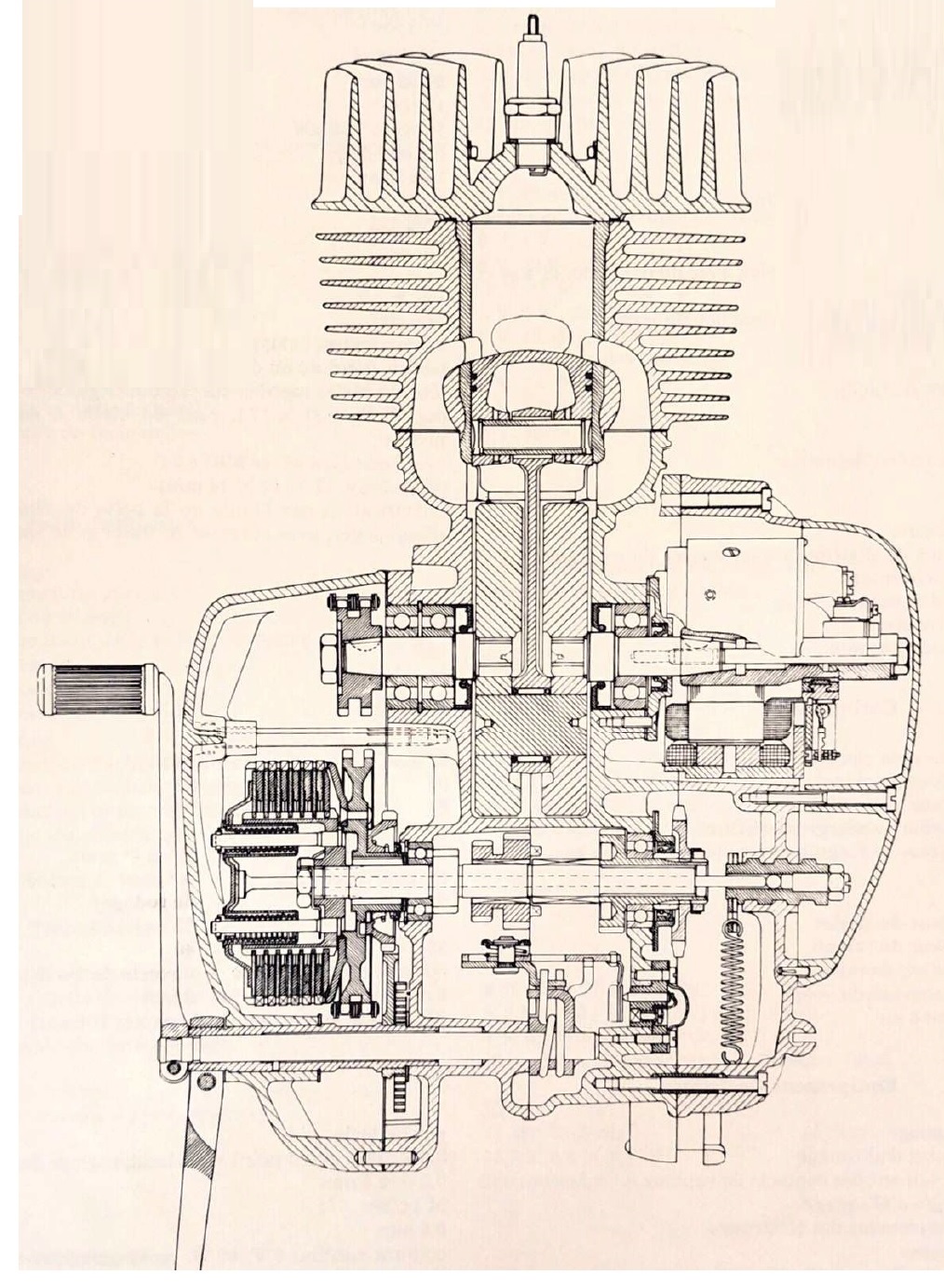 ll s'agit d'un bloc moteur à boite de vitesse intégrée à quatre rapports, la transmission primaire s'effectuant par chaine, l'embrayage est un multi-disques travaillant dans l'huile, les carters moteur sont en alliage léger tout comme la culasse à bougie centrale serrée sur le cylindre sans joint. Ce dernier également en alliage est chemisé acier.