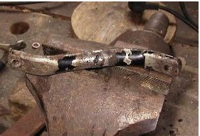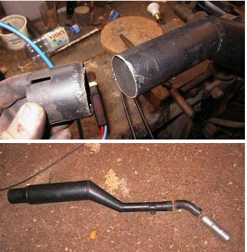 Le pot est alors monté à blanc sur la moto et maintenu à l'aide d'un morceau de fer plat facilement malléable pour trouver la bonne position, le collier récupéré à la casse permet un réglage précis.Il est alors pointé, les soudures ensuite réalisées après dépose