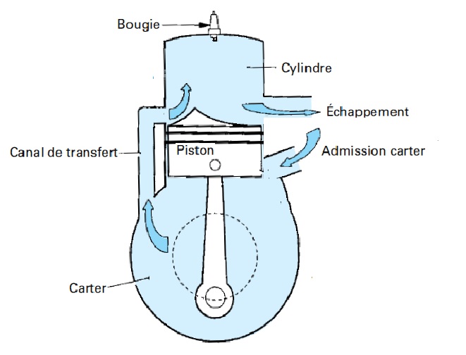 Quand le piston redescend, il pousse ce mélange dans les canaux de transfert afin de le faire remonter au dessus, quand le piston remonte à nouveau, le cylindre étant fermé par la culasse, il comprime fortement le mélange air/essence, à un moment précis une bougie d’allumage fourni une étincelle qui enflamme le mélange ce qui provoque la poussée sur le piston, puis le cycle recommence, en remontant le piston pousse également les gaz brûlés vers l’échappement