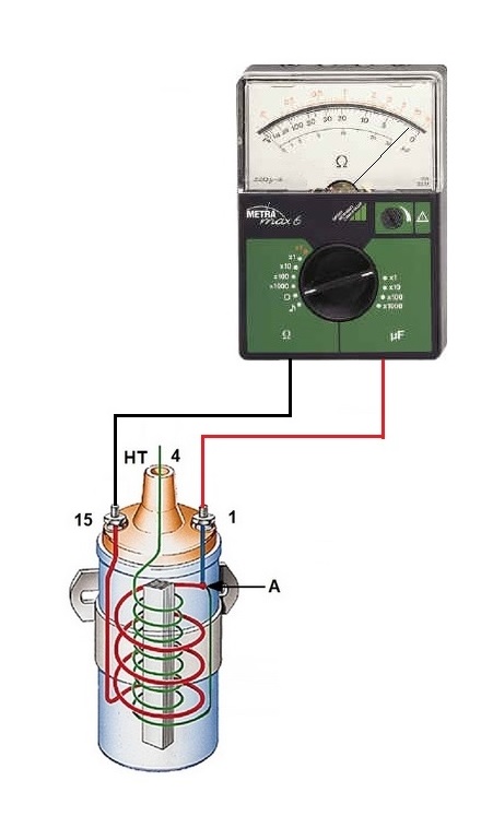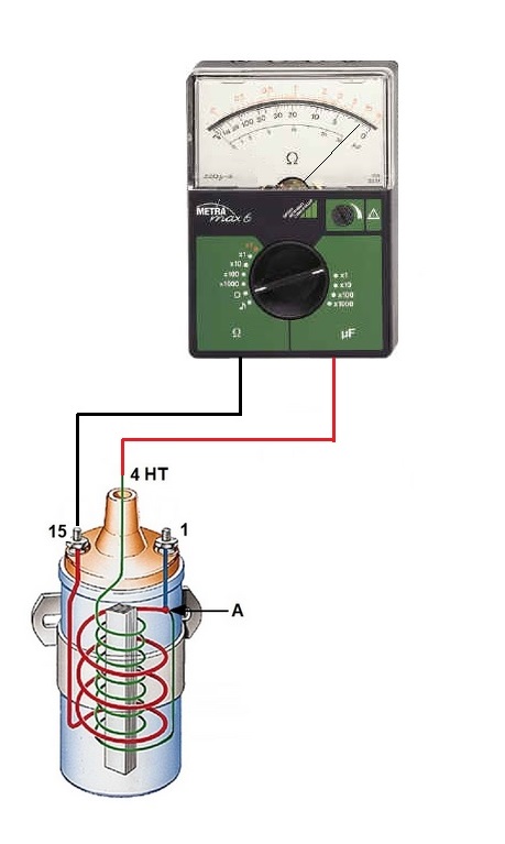Mesurer la résistance du circuit primaire entre la borne 1 et la borne 15 de la bobine, on doit trouver, entre 1,8 et 2 Ohms pour une 6V , entre 4,8 et 5 Ohms pour une 12V.