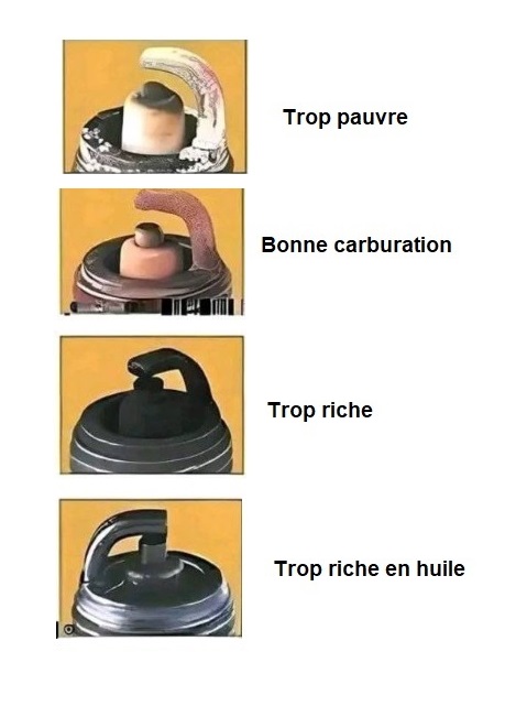 Si la proportion air/essence du mélange gazeux est trop riche en essence ça peut venir d'un mauvais réglage du carburateur (voir plus haut) ou d'un manque d'air du à un filtre à air colmaté.