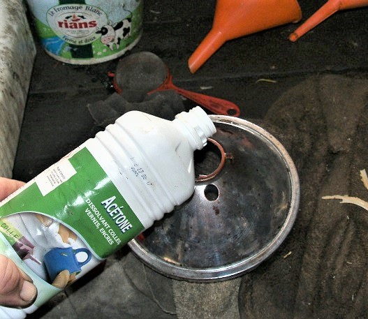 On va dissoudre la colle d'assemblage avec de l'acétone qu'on versera dans le bol jusqu'à hauteur du joint.