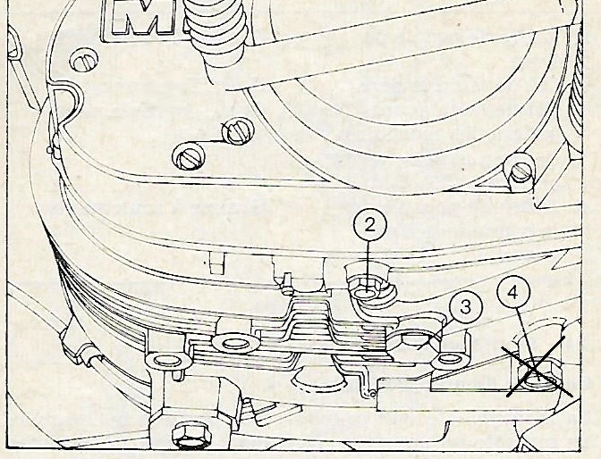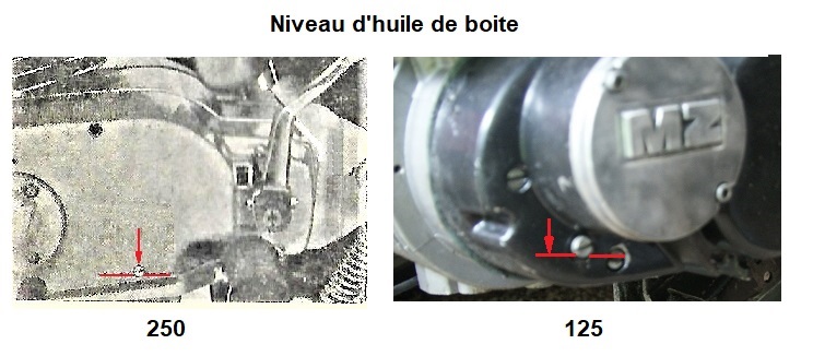 Le carter de boite est constitué de deux compartiments qui communiquent entre eux, celui de la boite et celui de l'embrayage et de la transmission primaire, pour que la vidange soit complète il faut également déposer les bouchons de vidange du compartiment de l'embrayage (repère 1 pour les 250 et 2 pour les 125)