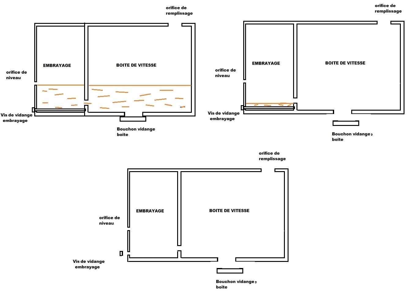 Après avoir positionné correctement un récipient propre, verser un peu plus que la quantité d'huile préconisée par l'orifice de remplissage, le surplus devrait s'écouler dans le récipient et pourra être récupéré. Lorsque ça ne coule plus, le niveau est bon et on peut refermer les bouchons de niveau et de remplissage.